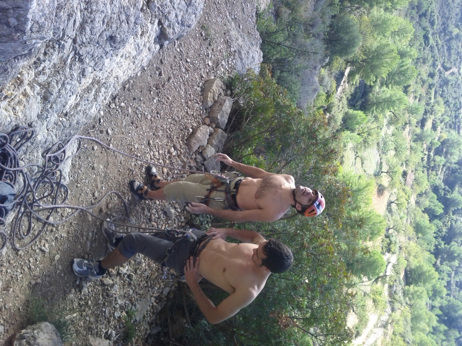 De ahí nos hemos ido a Il mensagero(6a+). Aquí se nos ha unido Iñaki de Alicante que se ha quedado colgado y desde ahí hemos escalado los tres. Esa la he montado yo y era una vía de placa en toda regla. Después de bastante tiempo sin escalar se notaba un poco la falta de confianza en los pies, pero después de un par de indecisiones he apretado y hasta la cadena ;-)